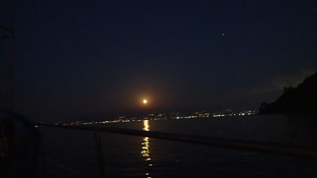 Apres une baignade dans une eau tiède (30,4°C) lever de pleine lune sur notre mouillage