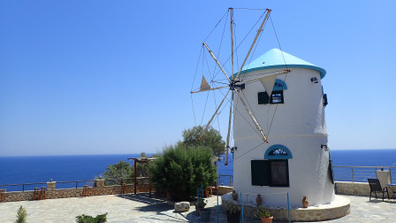 Au passage, vue sur un beau moulin. ça y est, on est "vraiment" en Grece, les couleurs sont celles des cartes postales!!!
